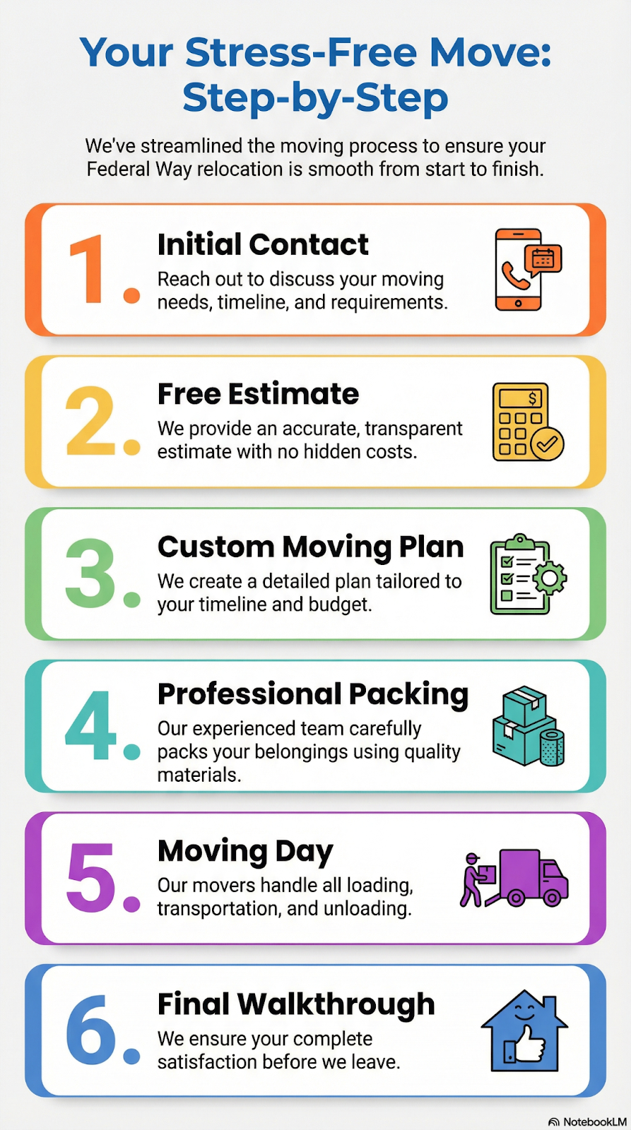1.) Initial Contact: Reach out to us by phone or through our website. We’ll discuss your moving needs, timeline, and any special requirements for your Federal Way move.